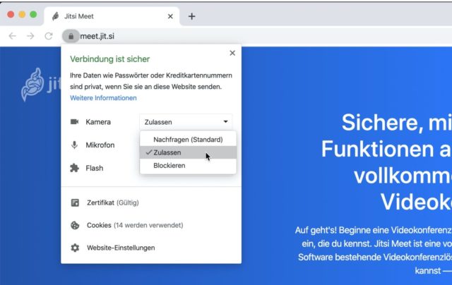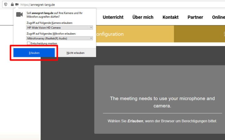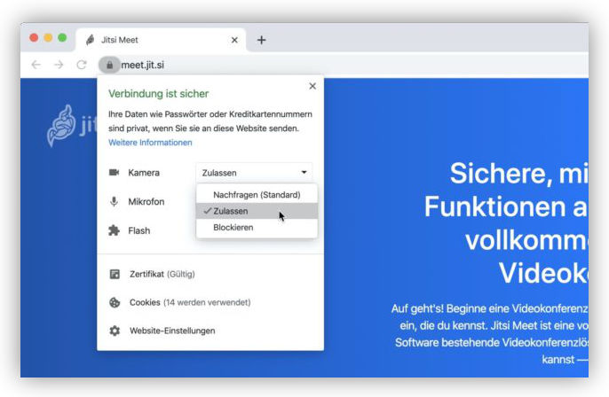 Im Browser sollten Kamera und Mikrofon ebenfalls zugelassen sein.