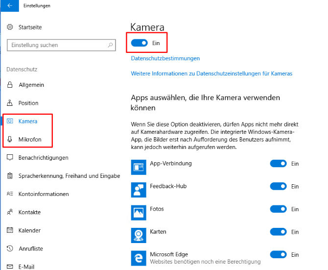 - Gehe auf „Start“ und dann „Einstellungen“ > „Datenschutz“ > Kamera/ Mikrofon